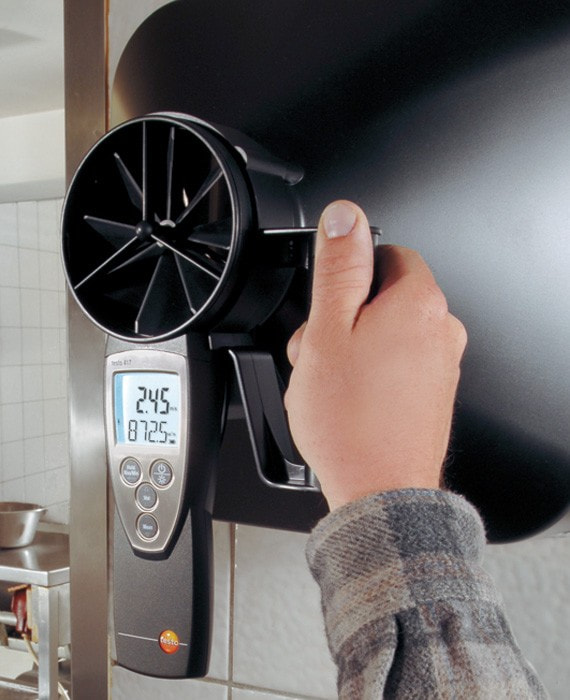 Компактный анемометр testo 417 со встроенной крыльчаткой для измерения скорости воздуха и температуры диаметром 100 мм, для измерения скорости потока, объемного расхода и температуры.