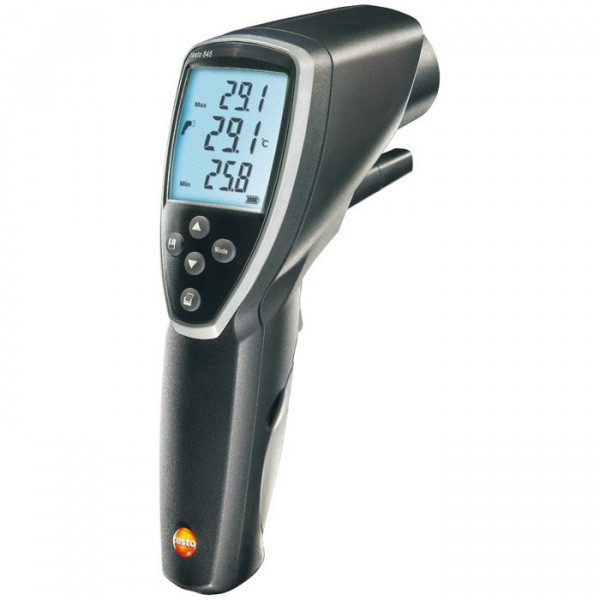 Инфракрасный термометр сo встроенным модулем влажности Testo 845 — впервые, температура поверхностей с малыми диаметрами может быть измерена с близкого и дальнего расстояния. Переключаемая оптика с длинным/коротким фокусом делает возможным подобные измерения. Измерения на большом расстоянии выполняются при оптическом разрешении 75:1. Таким образом, температура поверхности может быть точно измерена на большом расстоянии от объекта измерений. На расстоянии 1,2 м от объекта измерений диаметр измерительной точки составляет всего 16 мм. Крестообразный лазерный целеуказатель точно указывает место измерения. При измерениях с близкого расстояния от объекта, короткофокусная оптика обеспечивает диаметр точки в 1 мм на расстоянии 70 мм. Два лазера точно указывают место измерения.