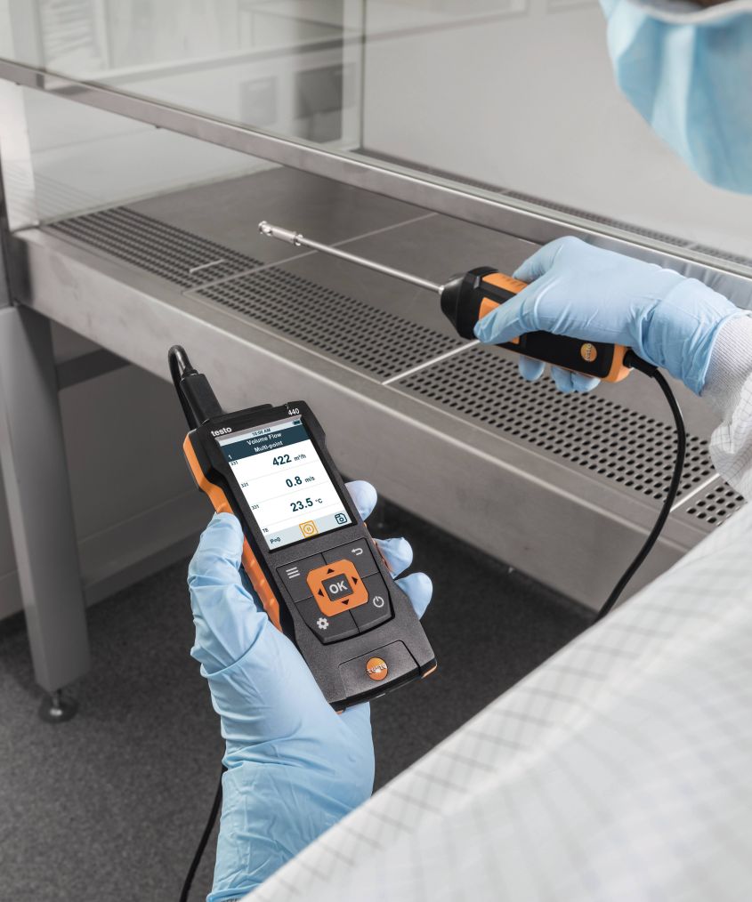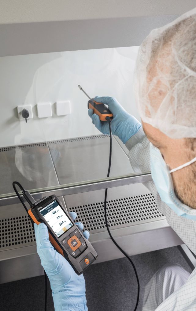 - С интуитивным управлением: четко структурированное измерительное меню для измерения скорости воздуха и объемного расхода в лабораторных вытяжных шкафах согласно DIN EN 14175-3/-4