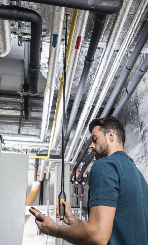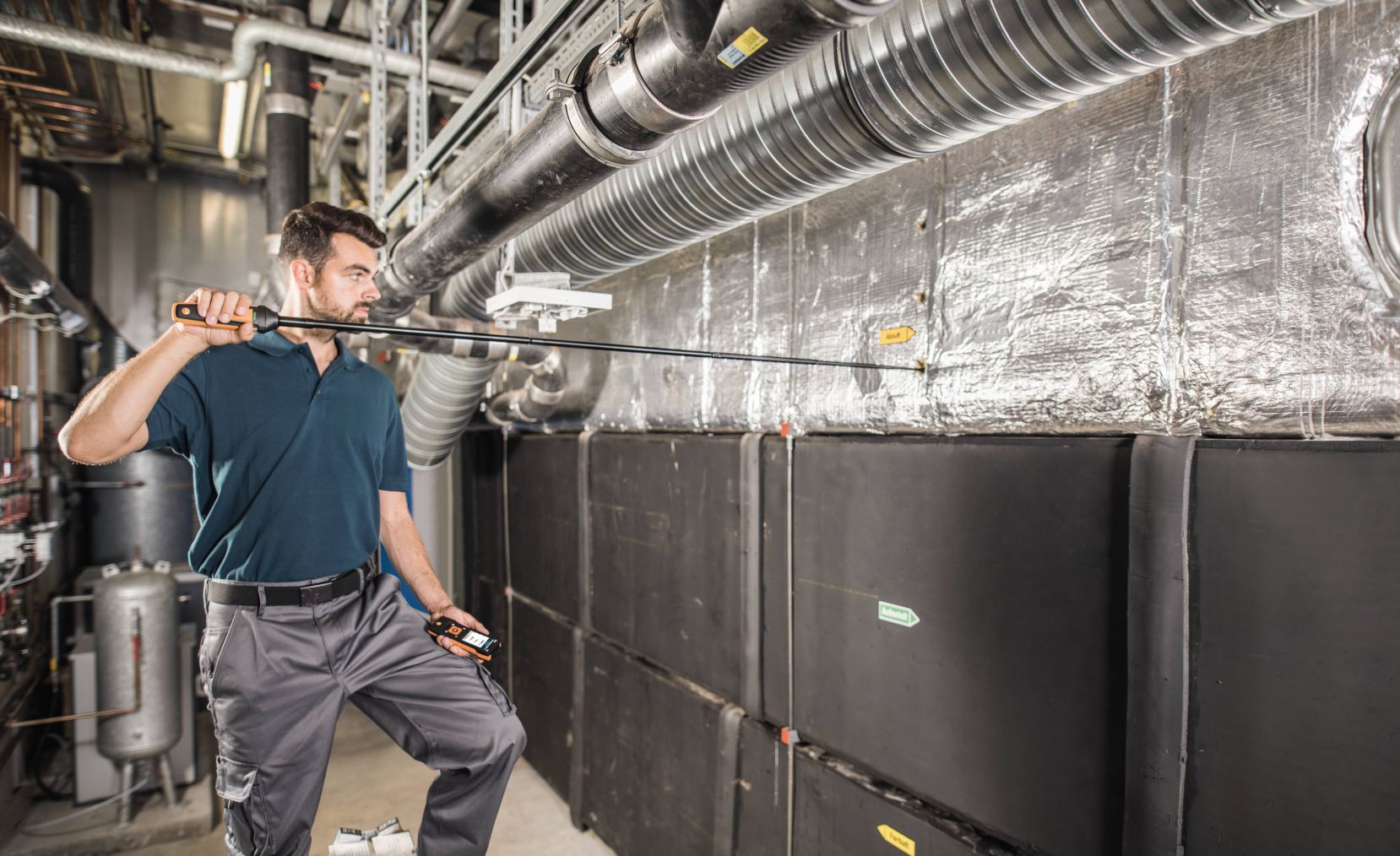 Для измерений в воздуховодах систем вентиляции: используйте зонд с обогреваемой струной (с совместимым измерительным прибором) для измерения скорости воздуха, объёмного расхода, температуры и влажности. Исключительное удобство: результаты передаются на ваш измерительный прибор по Bluetooth.