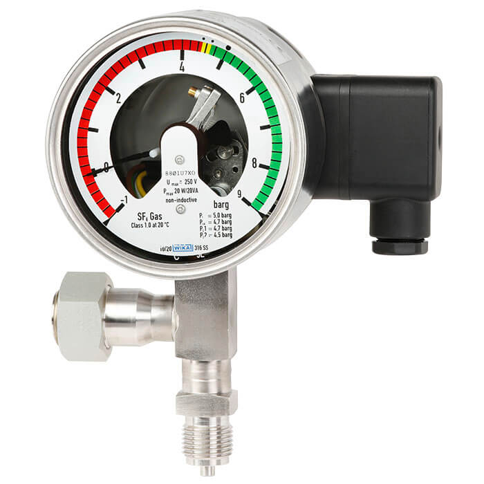 Плотномер элегаза WIKA обеспечивает надежную индикацию при опасном снижении уровня газа, даже в экстремальных условиях окружающей среды. Электроконтакты обеспечивают предупреждение оператора при падении плотности изолирующего газа ниже заданного значения уставки в результате утечки.