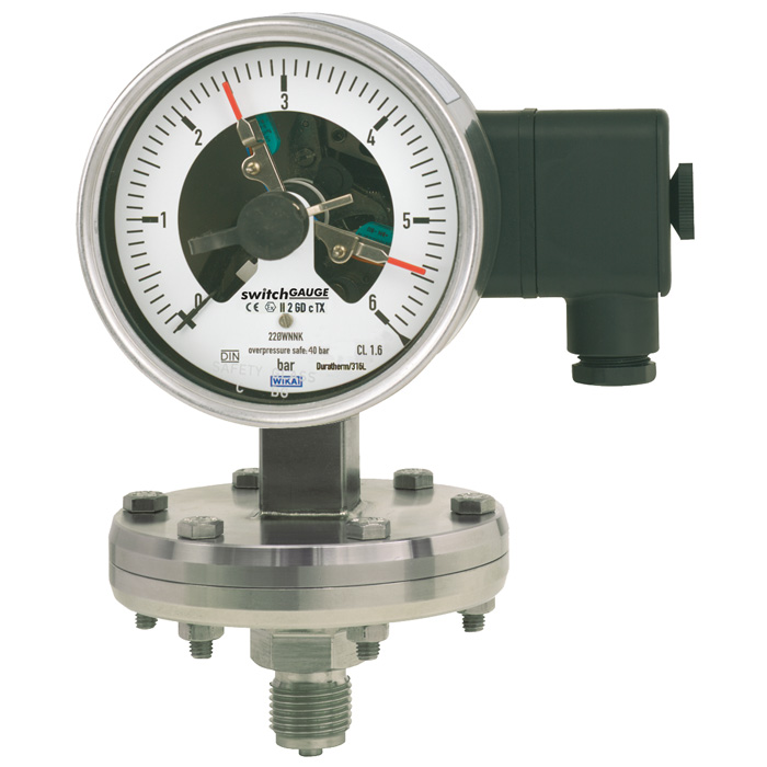 Электроконтакты (электрические сигнальные контакты) замыкают или размыкают цепи в зависимости от положения стрелки измерительного прибора. Электроконтакты регулируются во всем диапазоне измерения (см. DIN 16085) и обычно монтируются под циферблатом, но иногда могут располагаться сверху него. Стрелка прибора (стрелка текущих значений) свободно перемещается в пределах полной шкалы, независимо от величины уставки.