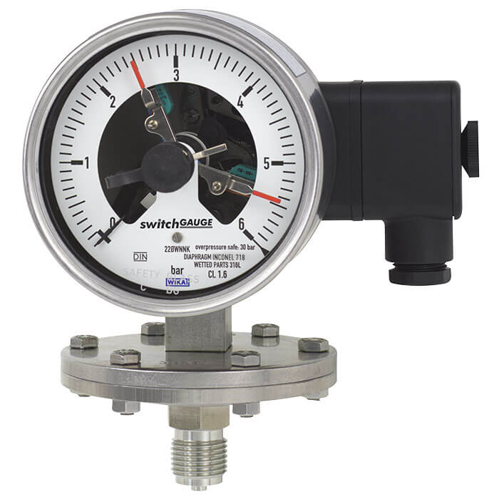 Электроконтакты (электрические переключающие контакты) замыкают или размыкают электрическую цепь в зависимости от положения стрелки измерительного прибора. Электроконтакты регулируются в пределах всего диапазона шкалы (см. DIN 16085) и монтируются в основном под циферблатом, но могут располагаться