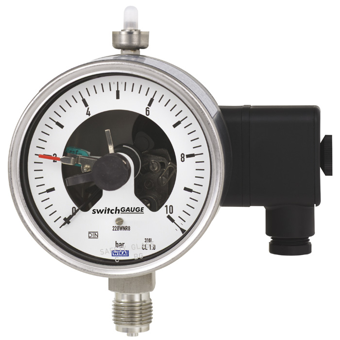 Электроконтакты (электрические сигнальные контакты) замыкают или размыкают цепи в зависимости от положения стрелки измерительного прибора. Переключающие контакты регулируются в пределах всего диапазона измерения (см. DIN 16085), и монтируются в основном под циферблатом, хотя иногда и над ним. Стрелка прибора (стрелка текущих значений) свободно перемещается в пределах полной шкалы независимо от величины уставки.